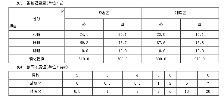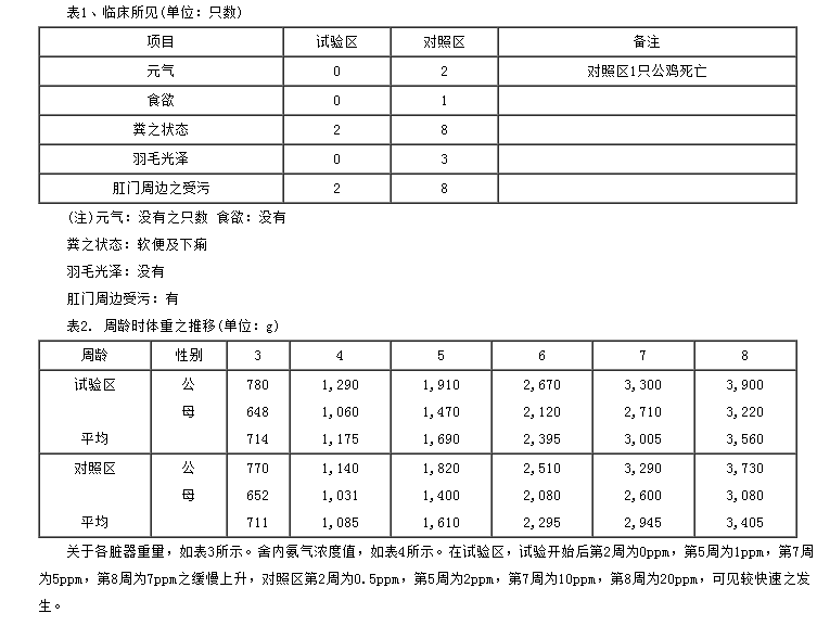 關(guān)于剖檢所見(jiàn),試驗(yàn)區(qū)15只全部沒(méi)有病變。在對(duì)照區(qū),15只中試驗(yàn)開(kāi)始第58日,有1只死亡,2只肝臟腫大,1只出血點(diǎn),No.7號(hào)公雞,1月25日死亡,立即解剖,發(fā)現(xiàn)心臟、華膜囊腫大、腎褐色,診斷為暴斃病。此地特感深興趣的是,在試驗(yàn)區(qū),消化器官良好發(fā)達(dá),腸較厚有彈性。關(guān)于雞舍內(nèi)之氨氣濃度,試驗(yàn)區(qū)之上升較低值,但對(duì)照區(qū)之氨氣濃度,顯示隨日數(shù)之增進(jìn),較高之上升值。